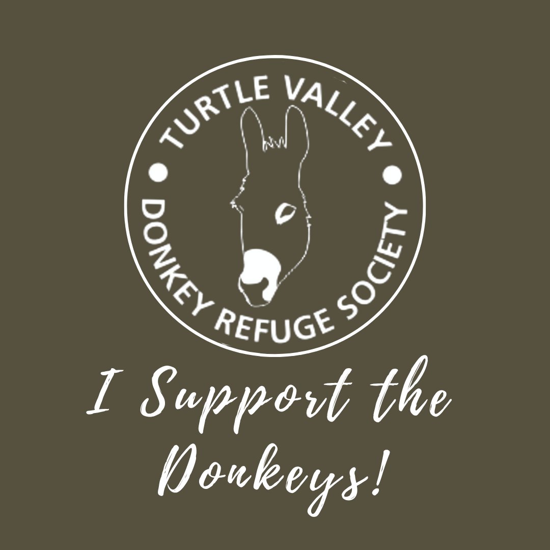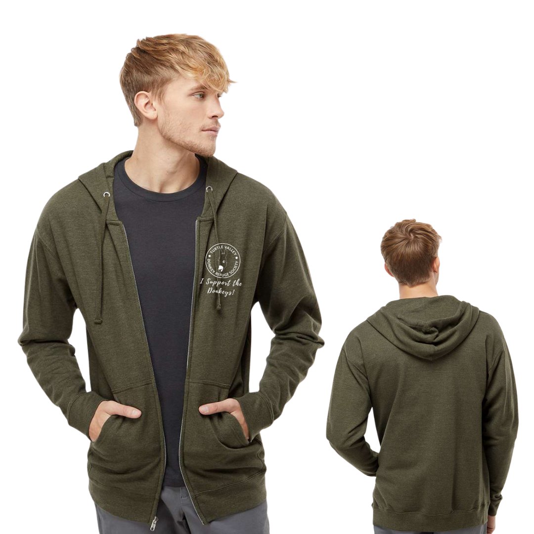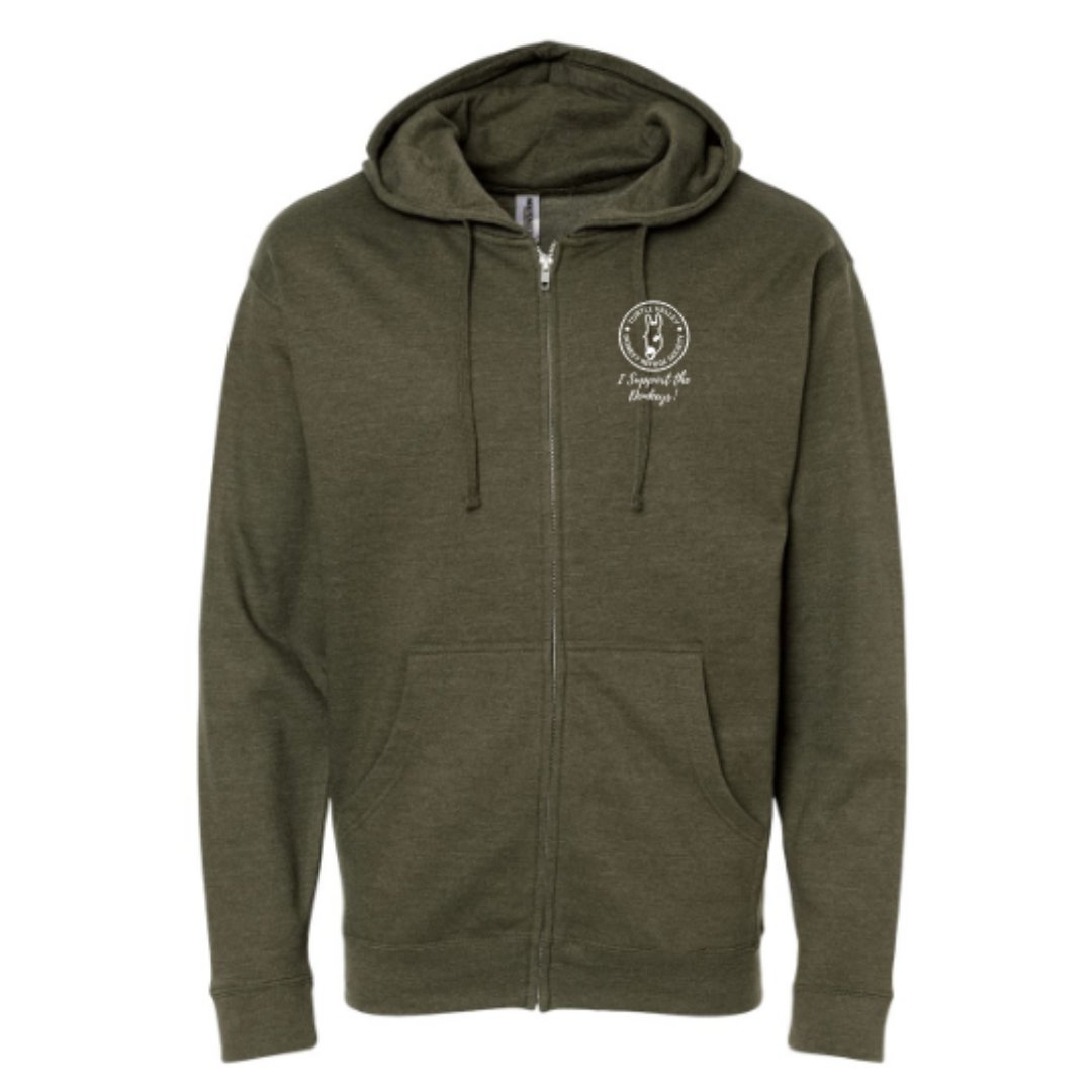 Each hoodie has been screenprinted with the Donkey Refuge Logo & white text under the logo that says "I Support the Donkeys!"